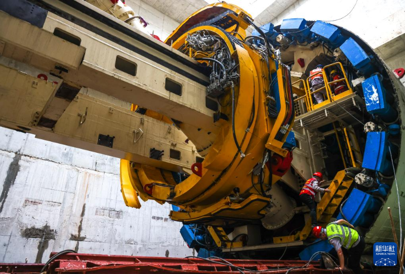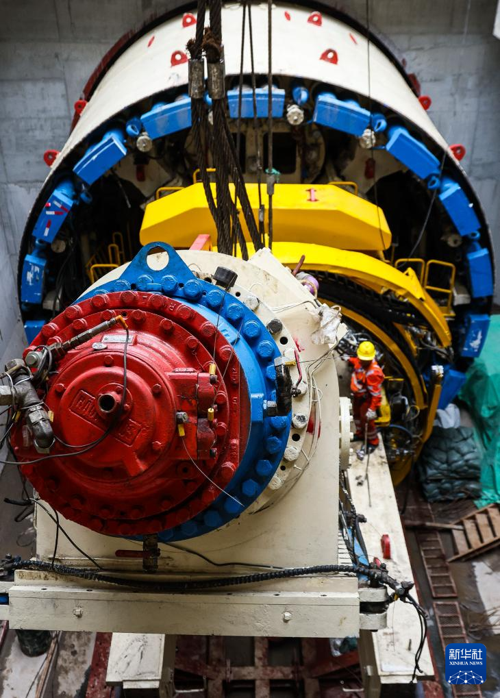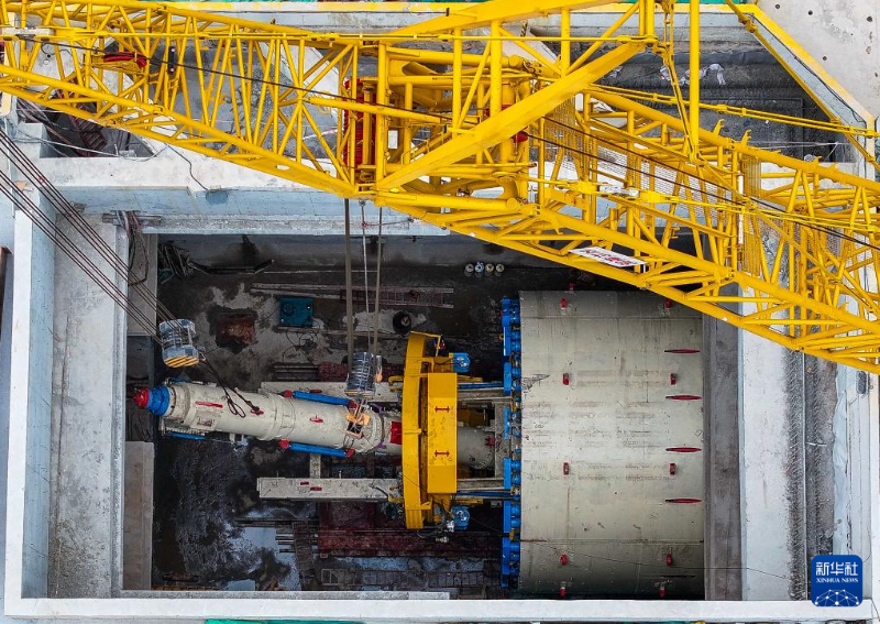 2月5日,建設(shè)者在南珠(中)城際十涌站盾構(gòu)井進(jìn)行右線盾構(gòu)機(jī)組裝作業(yè)。
