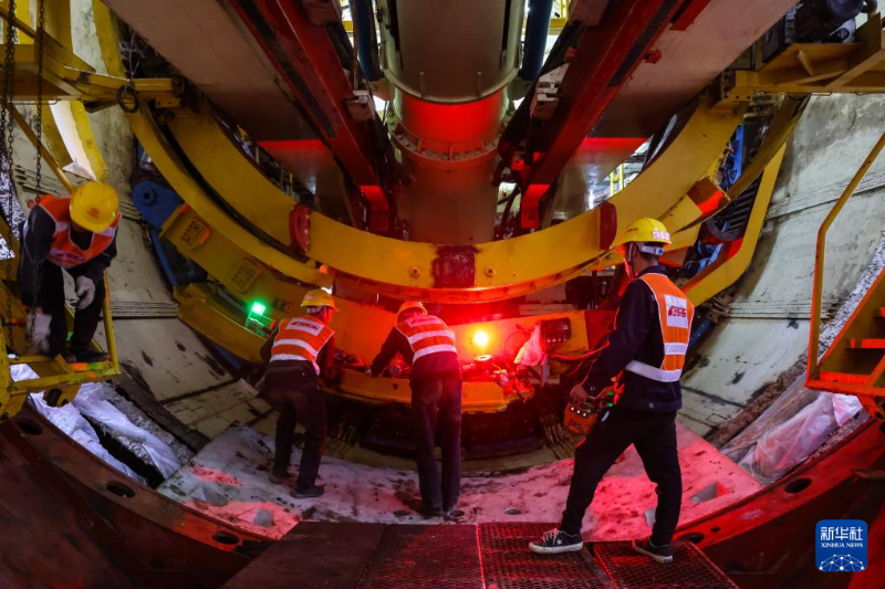 2月5日,建設(shè)者在南珠(中)城際十涌站調(diào)試左線盾構(gòu)機(jī)管片裝配設(shè)備。