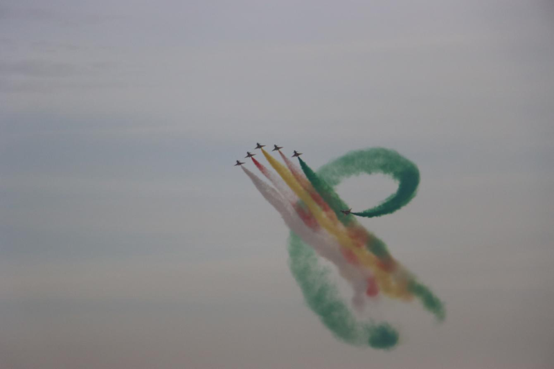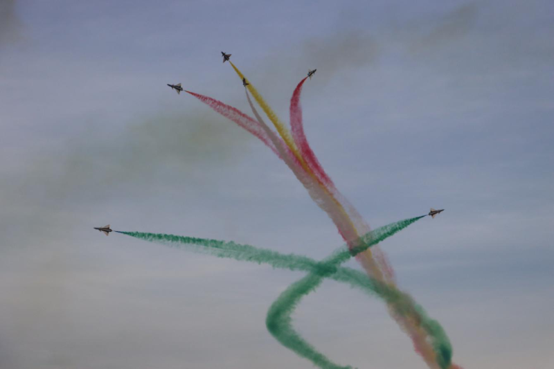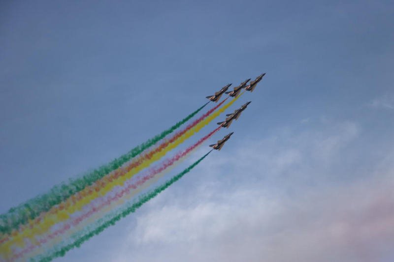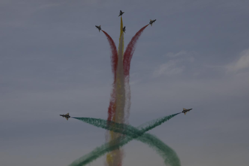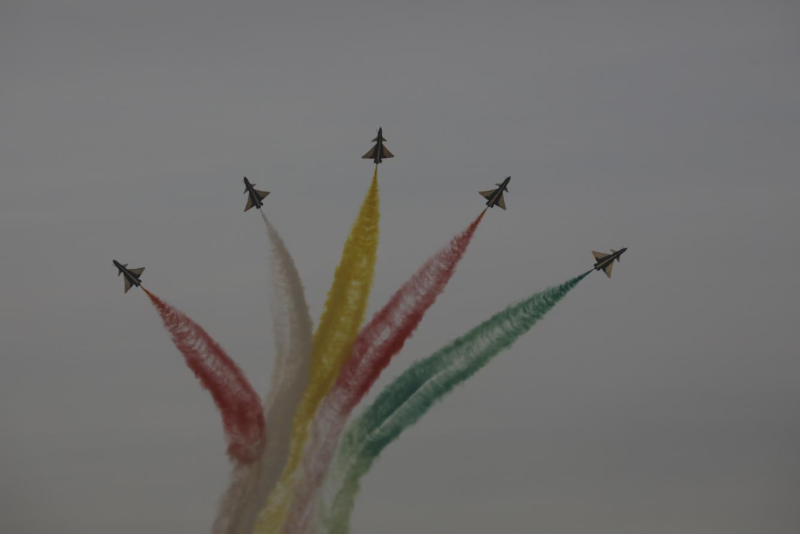 當(dāng)日的飛行表演中,空軍八一飛行表演隊連續(xù)做出“四機垂直開花”“五機水平開花”“六機分組開花”等一系列高難度表演動作。由象征中沙兩國國旗的“紅黃白綠”四種顏色組成的彩色拉煙,在高空綻放開花,時而如牽?;ㄩ_、金鐘倒掛,時而如天女散花、五彩絢爛,讓利雅得的上空更加色彩斑斕。