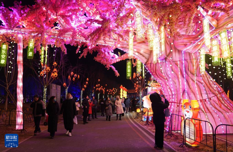 2月5日,游客在北京溫榆河公園觀燈賞景。