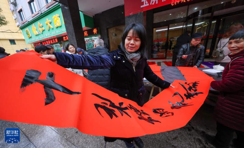 2月5日,市民在貴州省銅仁市玉屏侗族自治縣年集上領(lǐng)取書法志愿者免費(fèi)書寫的春聯(lián)。