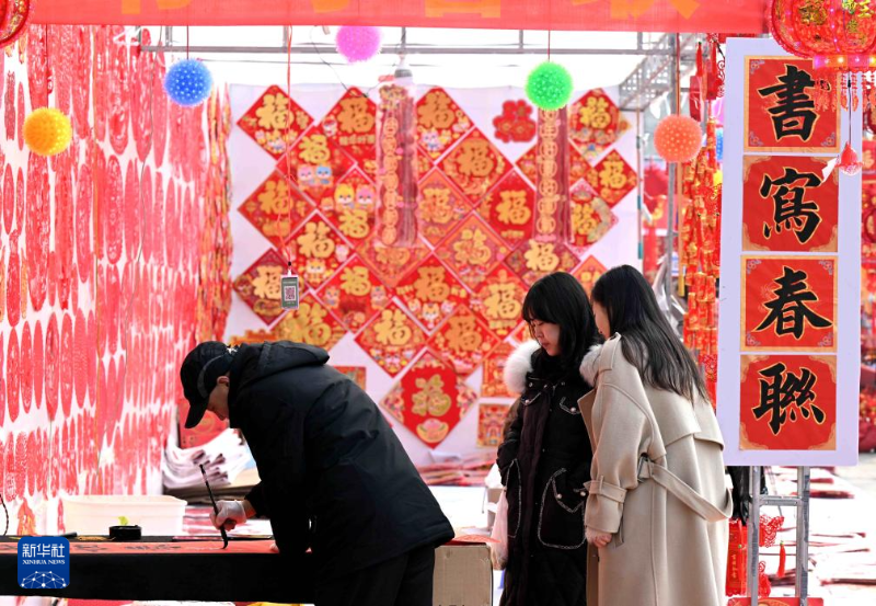 2月5日,在河北省石家莊市長(zhǎng)安區(qū)一家年貨市集,商家為市民現(xiàn)場(chǎng)寫春聯(lián)。