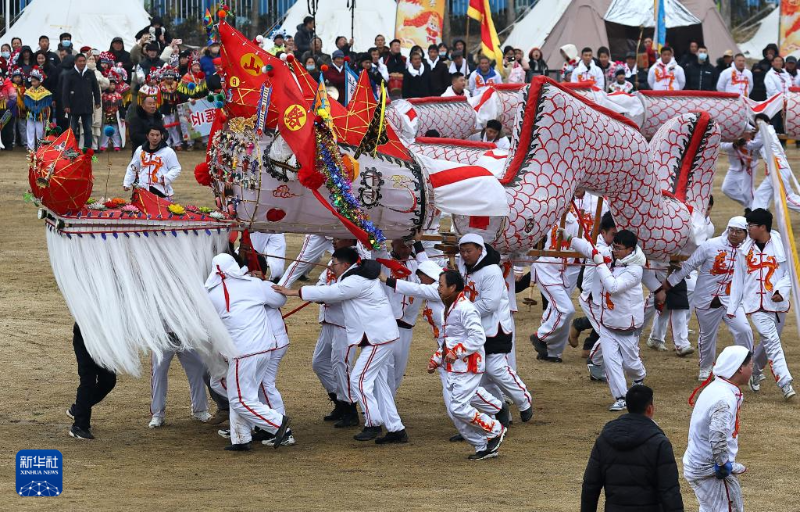 2月5日,人們?cè)诎不帐》蕱|縣包公故里文化園中表演國(guó)家級(jí)非遺項(xiàng)目“肥東洋蛇燈”