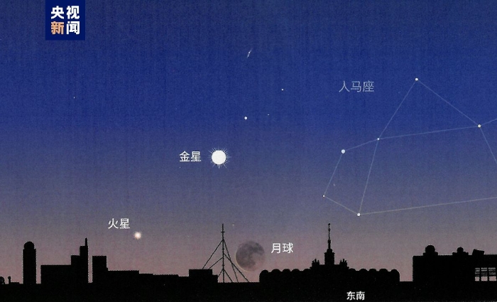 據(jù)天文專家介紹,8日早晨6點,以京津冀地區(qū)為觀測地的話,在東南方低空,人們首先可以看到明亮的金星,大約半個小時后,略微發(fā)紅色光芒的火星也將進入人們視野,火星位于金星的左下方,而一彎殘月將出現(xiàn)在金星的右下方位置,三者大致形成一個等邊三角形的構(gòu)圖。