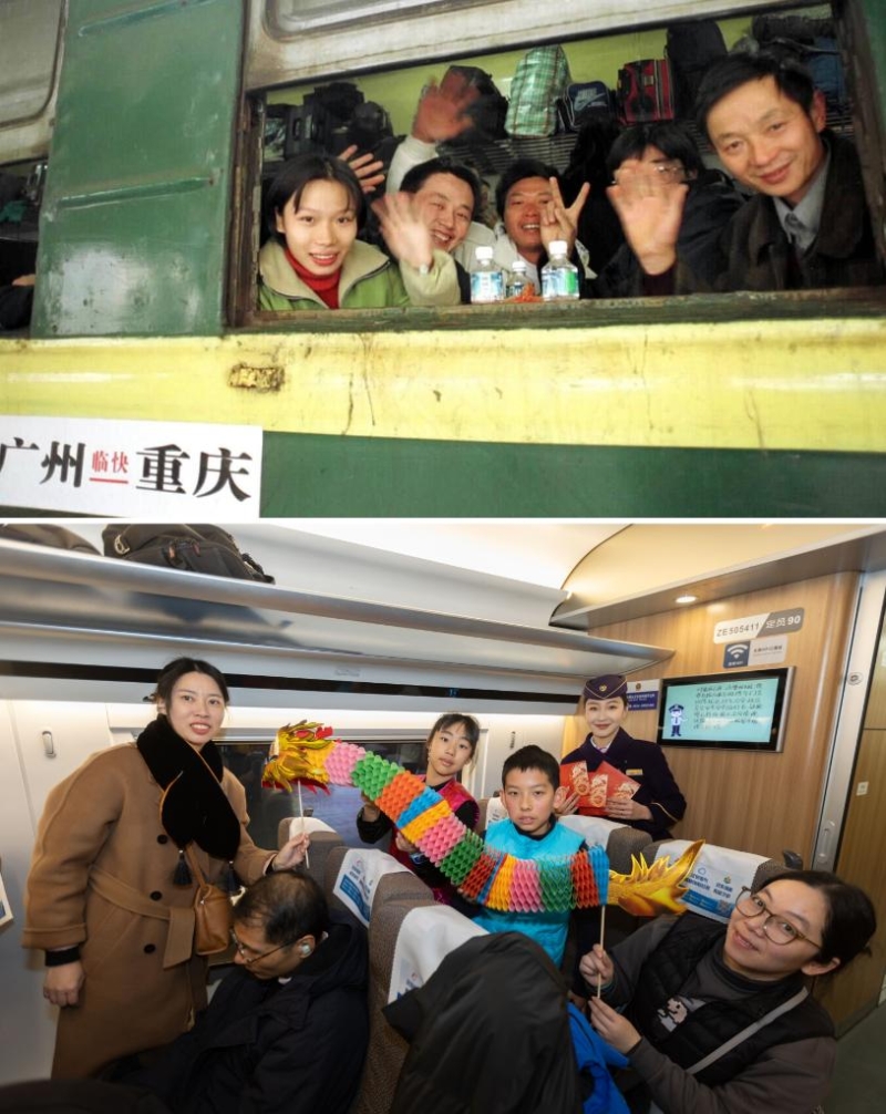 拼版照片:上圖為2000年春運期間,在深圳打工的重慶乘客在廣州火車站乘火車返鄉(xiāng)(新華社記者壯錦攝);下圖為2024年1月26日,旅客在G10次高鐵車廂內舞動龍年裝飾(新華社記者王翔攝)。