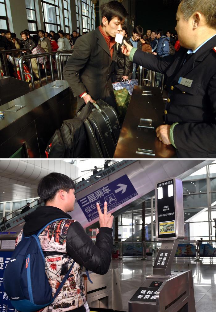 拼版照片:上圖為2006年1月14日,旅客在北京站通過人工檢票進站(新華社記者李文攝);下圖為2017年1月13日,一名旅客在廣州南站體驗使用人臉識別系統(tǒng)驗票驗證進站(新華社記者梁旭攝)。