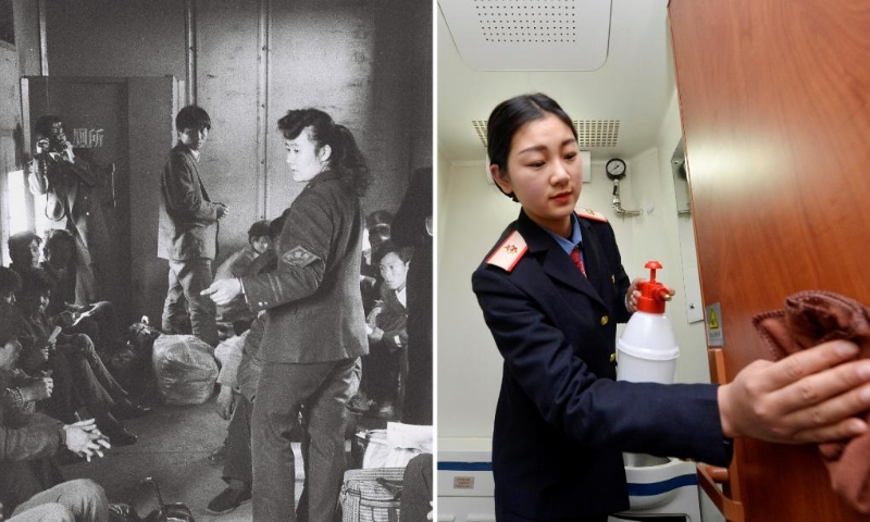 拼版照片:左圖為1994年春運期間,在濟南鐵路局“棚代客”列車上,乘務員在向乘客講解臨時搭建的簡易廁所使用注意事項(新華社發(fā));右圖為2017年1月12日,在蘭州鐵路局銀川客運段增開的銀川發(fā)往北京的臨時旅客列車上,乘務人員在清潔車上的衛(wèi)生間(新華社記者彭昭之攝)。
