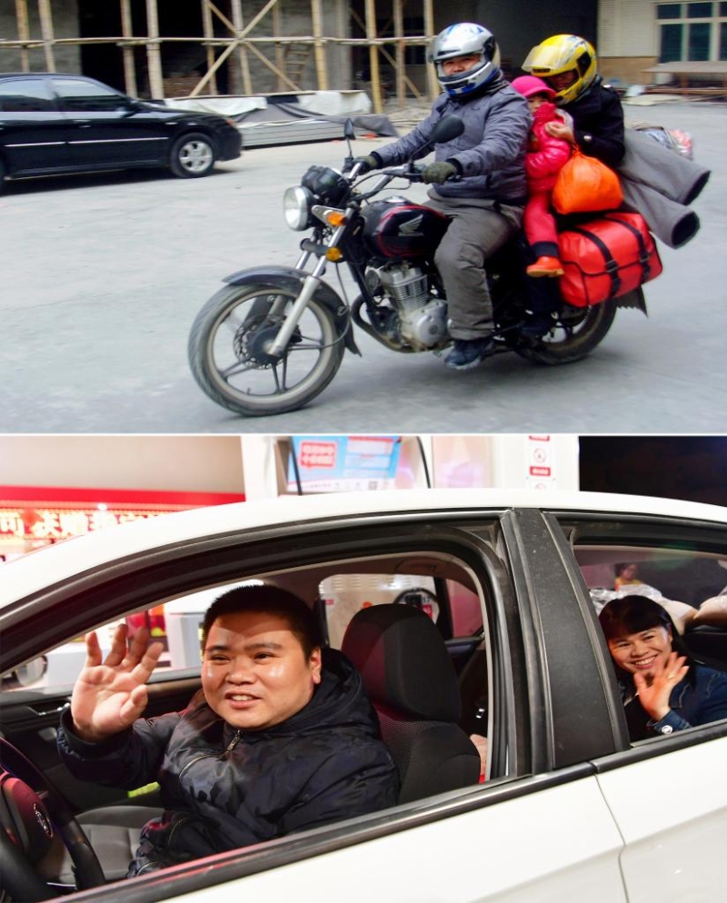 拼版照片:上圖為2013年2月2日,在福建務工的董日旭帶著家人騎摩托車返回江西老家過年(新華社發(fā));下圖為2020年1月15日,董日旭開著他新買的汽車,準備和家人開車返鄉(xiāng)過年(新華社記者魏培全攝)。