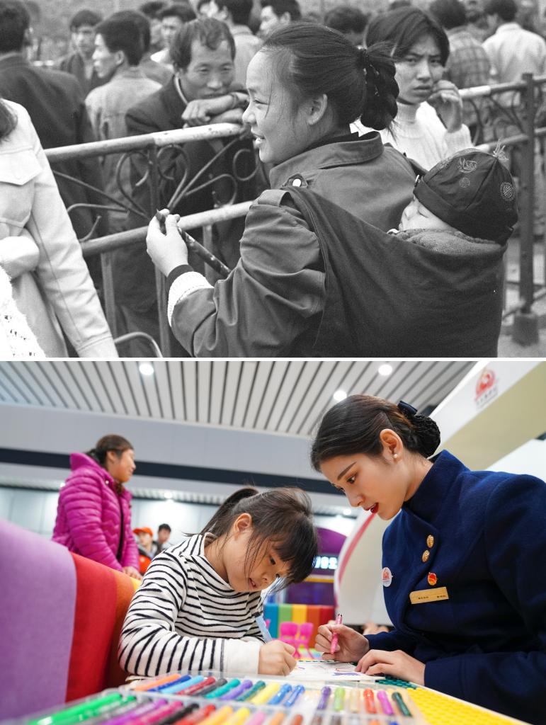 拼版照片:上圖為1995年春運期間,在廣州火車站,來自四川的“打工妹”趕早乘火車回家過年(新華社記者陳學思攝);下圖為2020年1月10日,在重慶西站紅巖服務站的兒童游樂園內,志愿者曾念紅(右)陪伴候車的小朋友畫畫(新華社記者劉潺攝)。