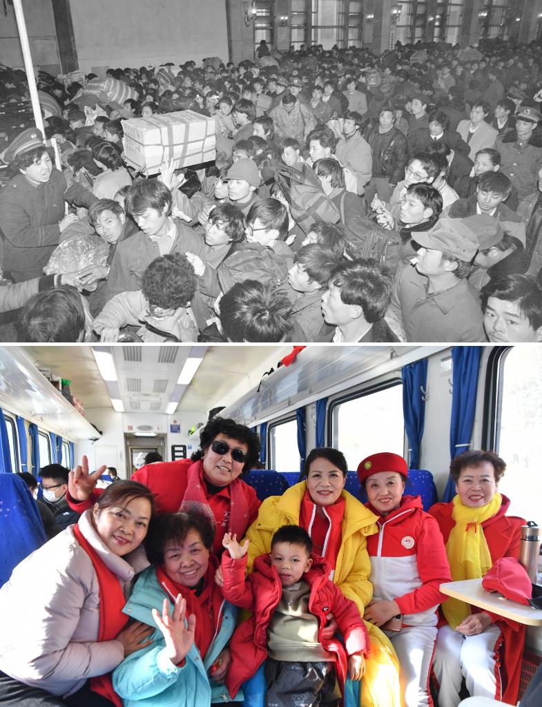 拼版照片:上圖為1993年春運期間,旅客在北京火車站排隊進站(新華社記者唐召明攝);下圖為2024年1月28日,乘坐公益“慢火車”6063次列車前往寶成鐵路秦嶺站欣賞雪景的旅客在車內合影(新華社記者張博文攝)。
