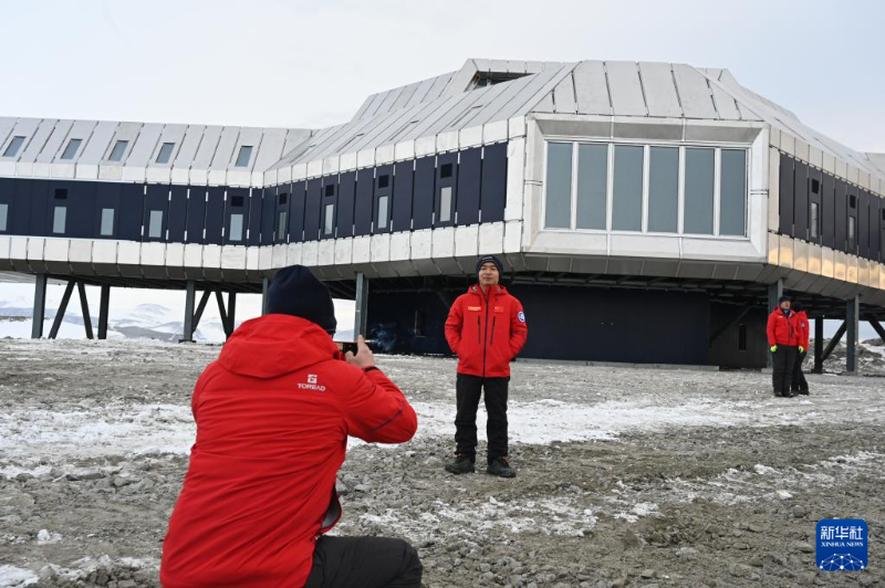 2024年2月6日,在中國(guó)南極秦嶺站開(kāi)站前,建設(shè)者們來(lái)到主樓前拍照留念。