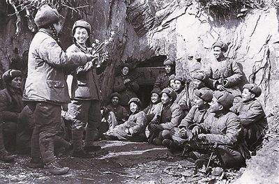 1953年,抗美援朝戰(zhàn)爭進入第四個年頭,志愿軍第140師駐守在臨津江西岸一帶執(zhí)行防御作戰(zhàn)任務。臨近春節(jié),該師后方指揮部決定成立1個小演唱隊,舉辦一場晚會,以歡度佳節(jié)、慰問戰(zhàn)友。很快,一個由干事、文化教員、會計等十幾名同志組成的演唱隊成立了。然而,演唱隊除1架手風琴、1把胡琴和4個口琴外,再無其他樂器。于是,大家開動腦筋,就地取材,尋找替代品。就這樣,手中的酒瓶、飯鍋、洗臉盆、飯碗都成了“樂器”。這個演唱隊也因此被稱為“鍋碗瓢盆協(xié)奏團”。2月13日農(nóng)歷大年三十,該演唱隊奔赴師前方指揮部注乙洞慰問演出,盡管演出的場地和器材較為簡陋,節(jié)目也不多,但個個精彩,既有合唱《中國人民志愿軍戰(zhàn)歌》,也有獨唱朝鮮民歌《阿里郎》、蘇聯(lián)歌曲《喀秋莎》,還有演奏廣東民樂《步步高》等。演出格外成功,現(xiàn)場一片歡聲笑語,極大地振奮了官兵士氣,展現(xiàn)出志愿軍戰(zhàn)士的革命樂觀主義精神。