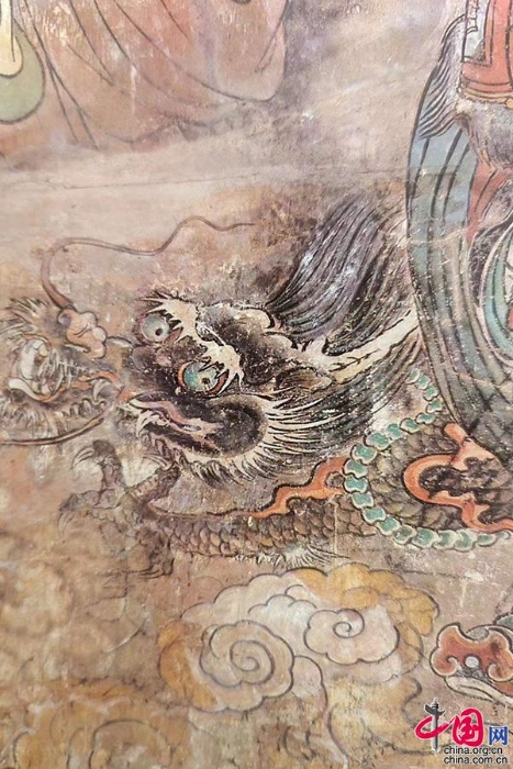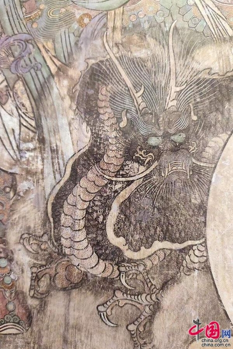 永樂宮三清殿朝元圖(元代)。一條出現(xiàn)在玉帝座前,一條跟隨在青龍星君身旁,游龍頭部扁小,嘴唇尖俏,龍爪鋒利、有力,肌肉隆起,與明清時代的龍形象相比明顯生動,動感十足,眼睛尤為傳神。在展現(xiàn)中國道教內(nèi)涵的壁畫中,皇天、后土的座前會分別繪有龍、鳳的圖案,來象征他們天地之尊的地位。