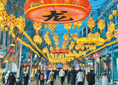 2月9日,游客在喜慶熱鬧的黑龍江哈爾濱市中央大街游玩。新華社記者 劉赫垚攝