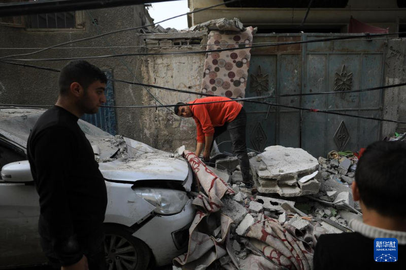 2月9日,在加沙地帶南部城市拉法,人們查看以軍空襲后的受損情況。新華社發(fā)(亞西爾·庫(kù)迪攝)