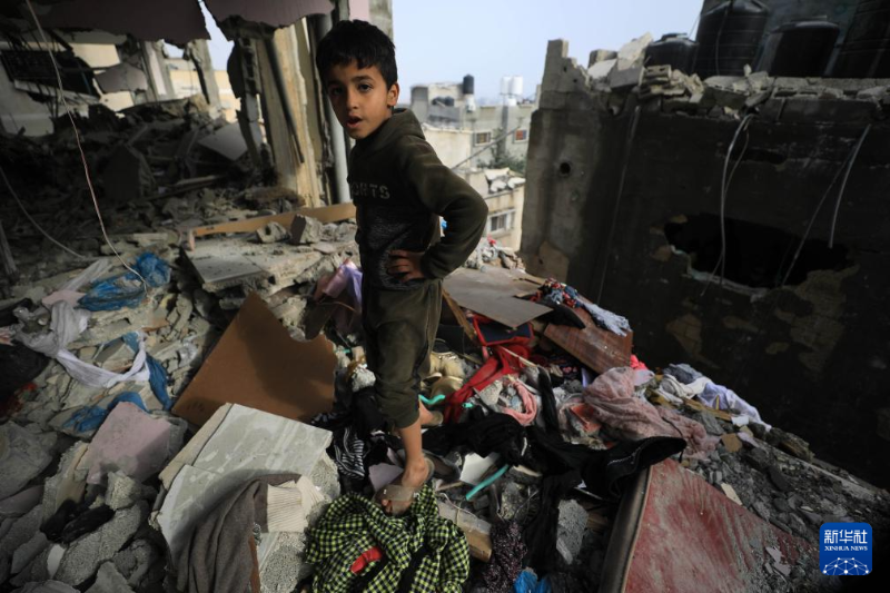 2月9日,在加沙地帶南部城市拉法,一名男孩站在以軍空襲后的廢墟中。新華社發(fā)(亞西爾·庫(kù)迪攝)