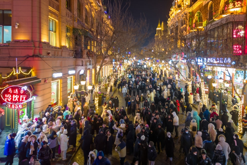 2024年1月9日,游客在哈爾濱百年老街中央大街上游玩(無人機(jī)照片)。新華社記者 張濤 攝