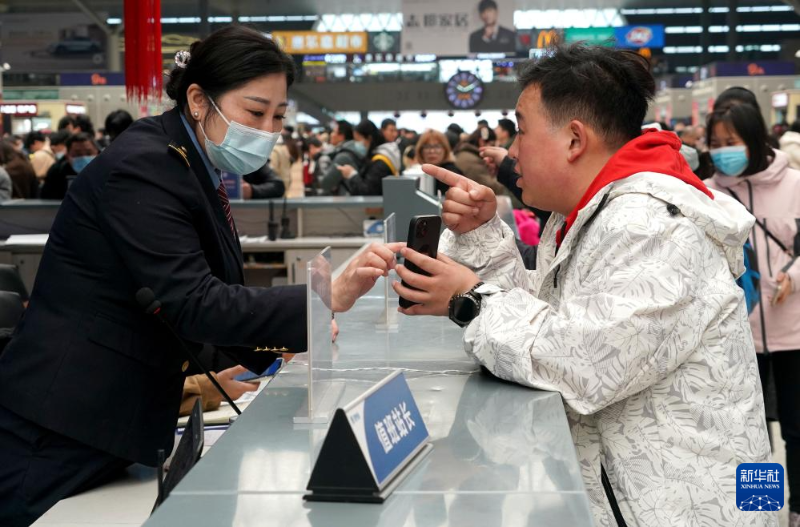 2月17日,在鄭州東站候車大廳,鐵路工作人員在解答旅客疑問。