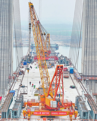 2月18日,湖北省襄陽市牛首漢江特大橋施工現(xiàn)場,施工人員在進行吊裝作業(yè)。謝 勇攝(新華社發(fā))
