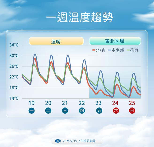 華夏經(jīng)緯網(wǎng)2月20日訊:據(jù)臺灣“中時新聞網(wǎng)”報道,臺灣地區(qū)今天各地多云到晴,北部高溫26至29度,中南部達(dá)30至32度,日夜溫差大,好天氣將持續(xù)到周四(22日)白天,傍晚鋒面掠過,接著東北季風(fēng)南下,北部、東半部轉(zhuǎn)雨;周五(23日)北部氣溫下降,高溫剩不到20度,周日(25日)冷空氣增強(qiáng),氣溫再降,強(qiáng)度達(dá)大陸冷氣團(tuán),下周一、二(26、27日)氣溫降到最低,部分平地下探10度。