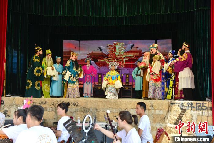 資料圖為2023年9月22日,陳禹瑄(右三)和劇團(tuán)演員們正在漳州市漳浦縣深土鎮(zhèn)車敖村唱戲。中新社記者 張斌 攝