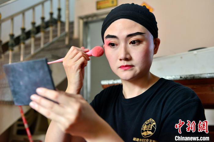 資料圖為2023年9月22日,陳禹瑄正在化妝,準(zhǔn)備上臺(tái)演出。中新社記者 張斌 攝