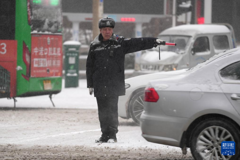 2月20日,在河北省石家莊市中山路,一名交警在雪中指揮交通。