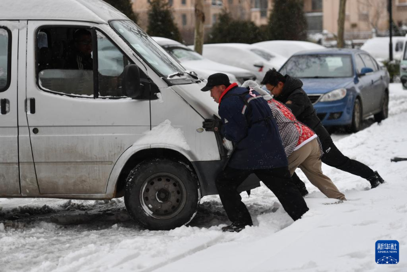 2月20日,在山東省青島市城陽區(qū),市民幫助受困車輛脫困。
