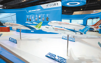 展館內(nèi),中國商飛公司展臺以“攜手同行 共創(chuàng)未來”為主題,展出了最新涂裝的1∶20比例C919、ARJ21和C929基本型飛機模型,1∶32比例ARJ21公務(wù)機、醫(yī)療機、應(yīng)急救援指揮機、滅火機、貨機模型以及C919縮短型/高原型和加長型等系列化飛機模型。室外靜態(tài)展區(qū)中,中國東方航空的C919客機、印尼翎亞航空的ARJ21客機和中原龍浩航空的ARJ21貨機齊聚,向來自世界各地的企業(yè)和公眾展示。