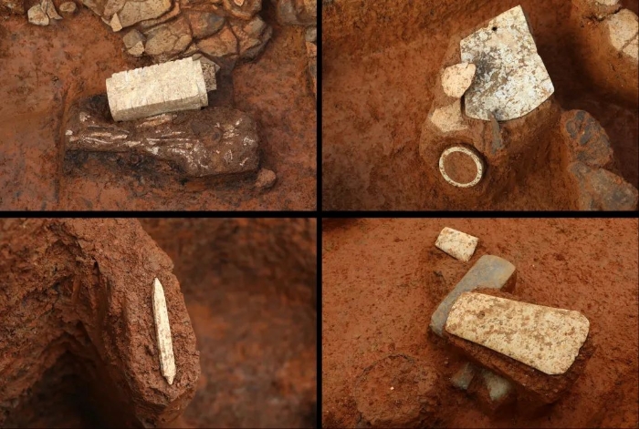 隨葬玉器出土現(xiàn)場(chǎng)(玉琮、玉鉞與玉環(huán)、玉錐形器、玉鉞)