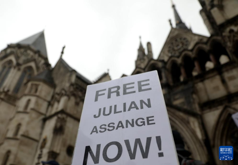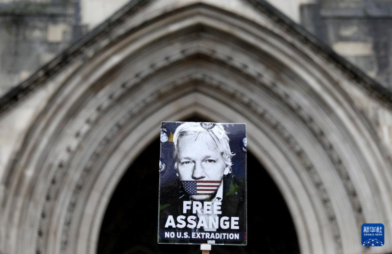 這是2月21日在位于倫敦的英國高等法院外拍攝的呼吁阻止將阿桑奇引渡至美國的標語牌。新華社記者 李穎 攝