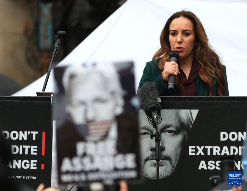 2月21日,在位于倫敦的英國高等法院外,阿桑奇的妻子斯特拉參加集會活動。新華社記者 李穎 攝