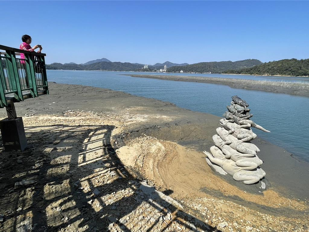 日月潭25日蓄水率剩76.19%,水位下降至744.55公尺(滿水位748.48)公尺,知名九蛙疊像全露。(楊靜茹攝,臺(tái)灣“中時(shí)新聞網(wǎng)”)