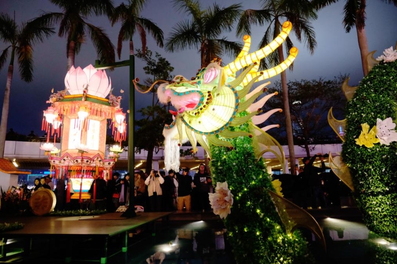 2月24日,人們?cè)谙愀奂馍尘诅姌桥再p花燈。新華社記者 王申 攝