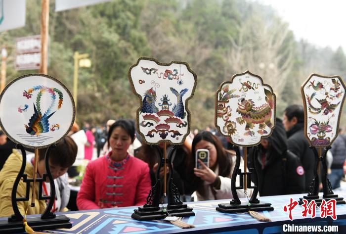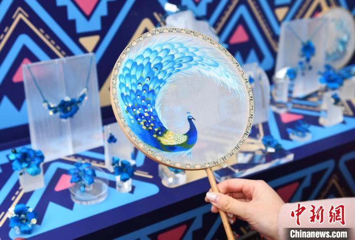 圖為酉州苗繡制作的扇子亮相重慶酉陽(yáng)非遺文創(chuàng)展。中新網(wǎng)記者 周毅 攝
