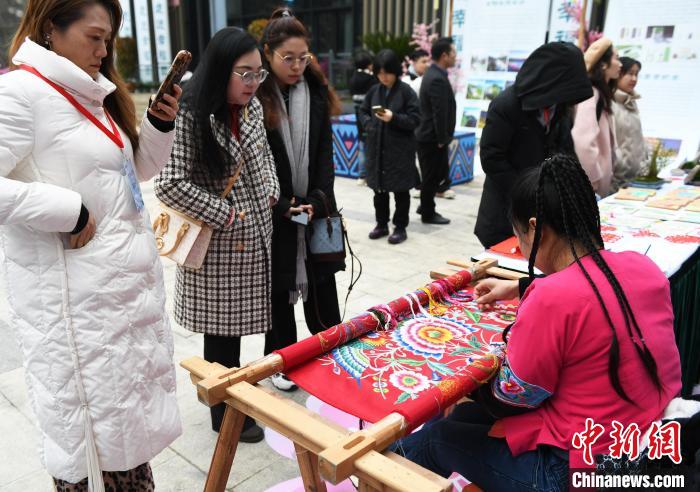 圖為繡娘現(xiàn)場(chǎng)展示苗繡技藝吸引眼球。中新網(wǎng)記者 周毅 攝