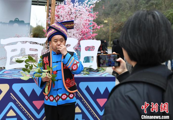 圖為酉陽(yáng)木葉吹奏非物質(zhì)文化遺產(chǎn)傳承人白現(xiàn)貴現(xiàn)場(chǎng)表演《木葉情歌》,吸引參觀者拍照留念。中新網(wǎng)記者 周毅 攝