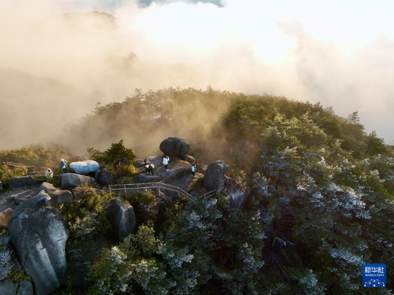 3月3日,游人在福建戴云山脈九仙山上觀看云海日出(無(wú)人機(jī)照片)。