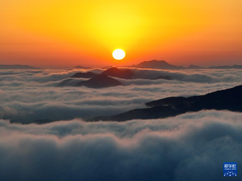 當(dāng)日,福建戴云山脈出現(xiàn)云海日出景觀,層巒疊翠的戴云群峰在云霧中若隱若現(xiàn),秀美如畫(huà)。