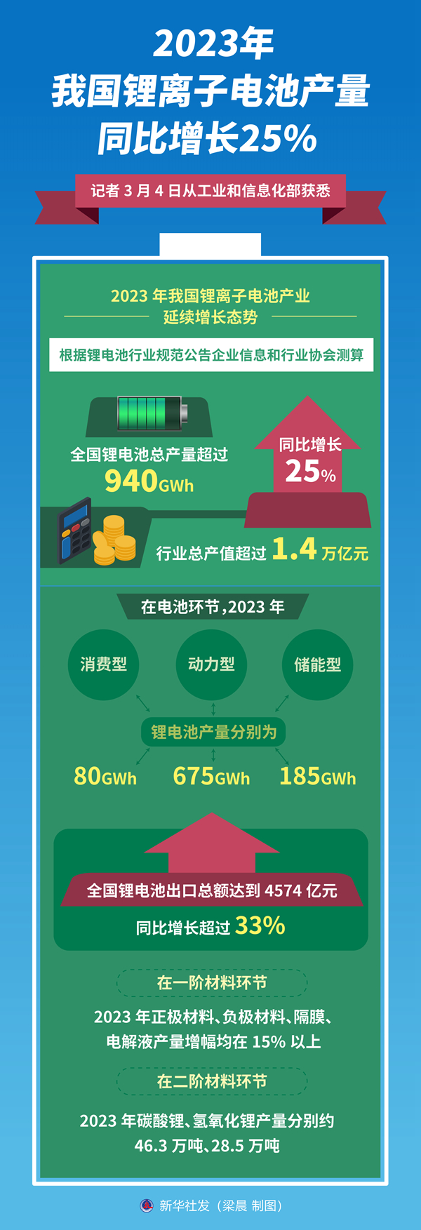 新華社北京3月4日電(記者王悅陽、張辛欣)記者4日從工業(yè)和信息化部獲悉,2023年我國鋰離子電池產(chǎn)業(yè)延續(xù)增長態(tài)勢,根據(jù)鋰電池行業(yè)規(guī)范公告企業(yè)信息和行業(yè)協(xié)會測算,全國鋰電池總產(chǎn)量超過940GWh,同比增長25%,行業(yè)總產(chǎn)值超過1.4萬億元。