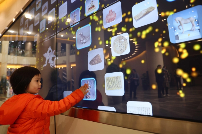 ▲小朋友點(diǎn)擊屏幕了解博物館有關(guān)文物的介紹