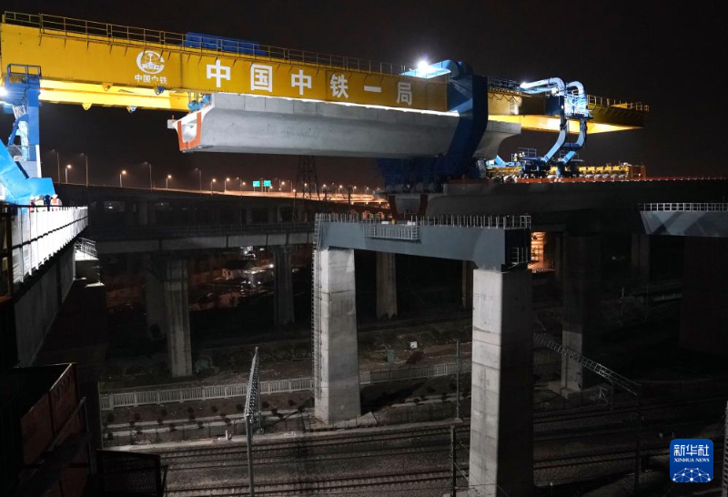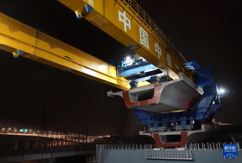 3月4日凌晨拍攝的滬蘇湖鐵路全線最后一榀箱梁架設(shè)施工現(xiàn)場。