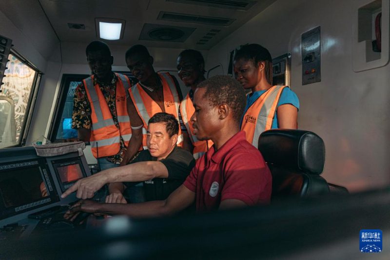 2月27日,在尼日利亞拉各斯,拉伊鐵路的中方員工指導(dǎo)當(dāng)?shù)匦逻M學(xué)員學(xué)習(xí)機車知識。
