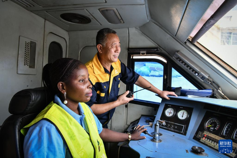 3月2日,在尼日利亞拉各斯的拉伊鐵路莫博拉吉·約翰遜火車站,中方指導(dǎo)司機魏汝軍與當(dāng)?shù)厮緳C塞拉·阿比亞拉在駕駛室調(diào)整車輛,準(zhǔn)備發(fā)車前往伊巴丹。