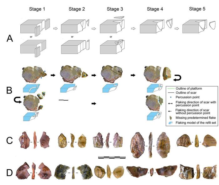 通過對岑家灣拼合組的石器技術(shù)分析和高精度3D掃描,研究團隊系統(tǒng)重建了遺址古人類的剝片技術(shù)和工具修理策略。結(jié)果表明,岑家灣遺址存在“準備石核技術(shù)”,其表現(xiàn)形式為生產(chǎn)具有一定標(biāo)準的最終產(chǎn)品。