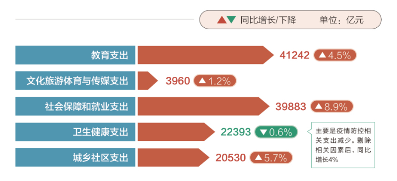 2023年,盡管財政收支壓力很大,但民生投入力度不減。超過27萬億元全國一般公共預(yù)算支出中,教育、社會保障和就業(yè)支出都在4萬億元上下,衛(wèi)生健康、城鄉(xiāng)社區(qū)支出都超過了2萬億元。