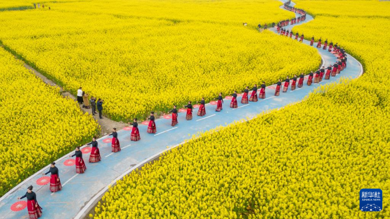 3月4日,在四川省眉山市彭山區(qū)五湖四海濕地公園油菜花田,來自眉山市老年大學的百余名漢服愛好者走秀表演(無人機照片)。