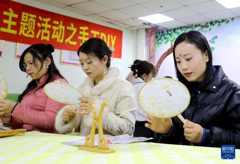 3月5日,在河南省濟源市濟源高新技術產業(yè)開發(fā)區(qū)科技園,女職工參加團扇手工制作活動。