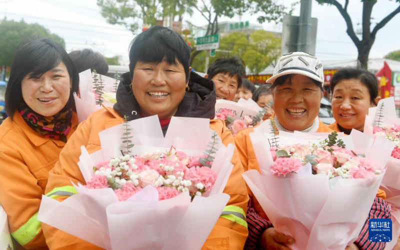 3月6日,在浙江省臺州市路橋區(qū)路南街道,女性環(huán)衛(wèi)工人收到當?shù)貗D聯(lián)贈送的鮮花。