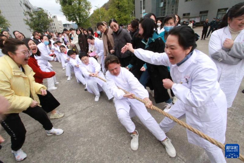 3月6日,在福建省南平市順昌縣總醫(yī)院,女醫(yī)護人員在參加撥河比賽。